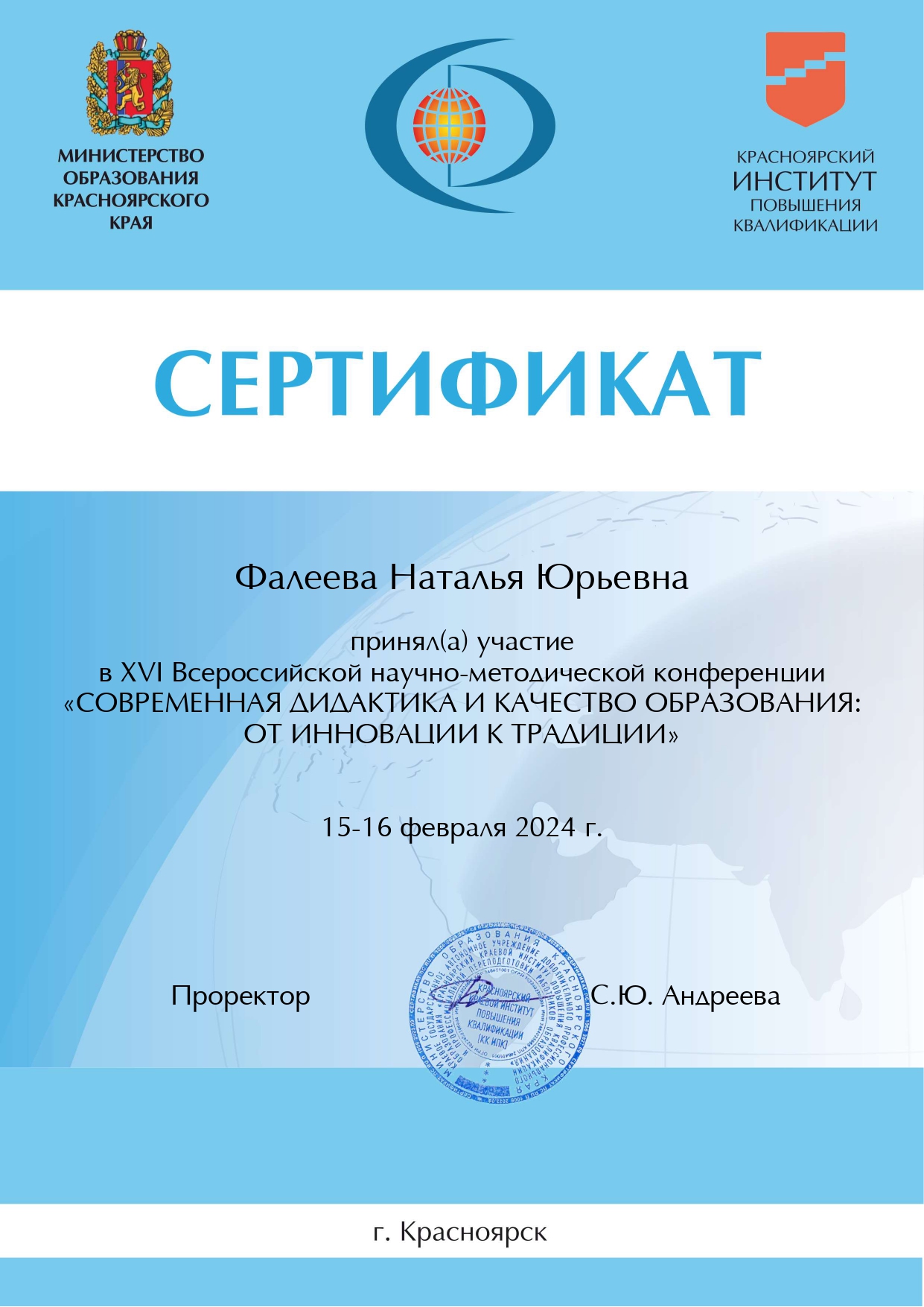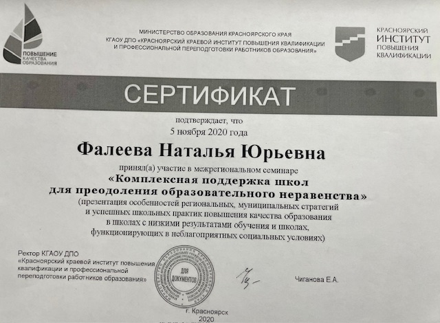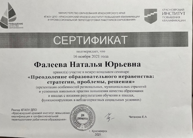 • Участник Межрегионального семинара «Преодоление образовательного неравенства: стратегии, проблемы, решения»  16.11.2021 / МО КК, КГАОУ ДПО КК ИПКиПП РО, г.Красноярск