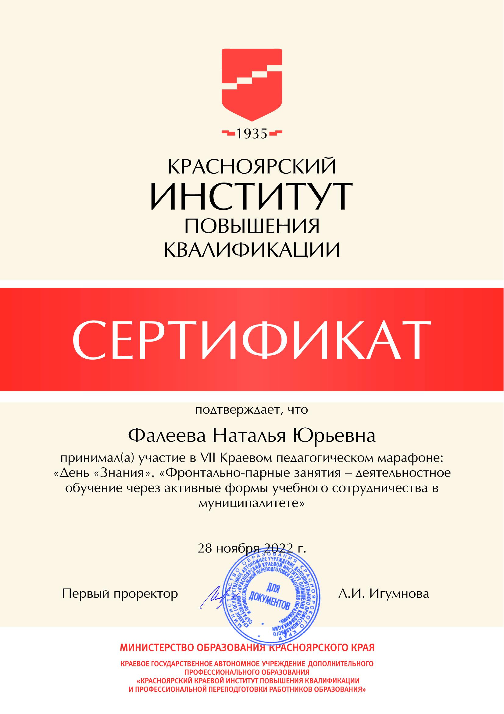 VII Краевой педагогический марафон  «Фронтально-парные занятия – деятельностное обучение через активные формы учебного сотрудничества в муниципалитете», 28.11.2022 / КИПК, г.Красноярск  https://kipk.ru/images/docs/local/Ped-maraphon-2022-programma-MOBU-SOSH-16-Minusinsk.pdfhttps://kipk.ru/images/docs/local/Ped-maraphon-2022-pr-SOSH-5-FPZ.pdfhttps://kipk.ru/images/docs/local/Ped-maraphon-2022-pr-SOSH-5-FPZ-opisanie.pdfhttps://kipk.ru/images/docs/local/Ped-maraphon-2022-pr-SOSH-5-FPZ-zadznie-IOM.pdf,