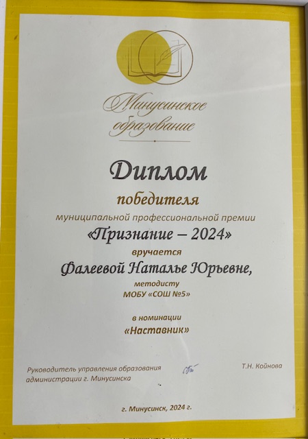 • Почетная грамота Администрации города Минусинска в связи с празднованием Дня учителя и за значительный вклад в развитие муниципальной системы образования